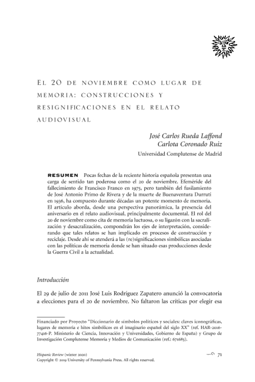 Resumen: Pocas fechas de la reciente historia española presentan una carga de sentido tan poderosa como el 20 de noviembre. Efeméride del fallecimiento de Francisco Franco en 1975, pero también del fusilamiento de José Antonio Primo de Rivera y de la muerte de Buenaventura Durruti en 1936, ha compuesto durante décadas un potente momento de memoria. El artículo aborda, desde una perspectiva panorámica, la presencia del aniversario en el relato audiovisual, principalmente documental. El rol del 20 de noviembre como cita de memoria luctuosa, o su ligazón con la sacralización y desacralización, compondrán los ejes de interpretación, considerando que tales relatos se han implicado en procesos de construcción y reciclaje. Desde ahí se atenderá a las (re)significaciones simbólicas asociadas con las políticas de memoria donde se han situado esas producciones desde la Guerra Civil a la actualidad.